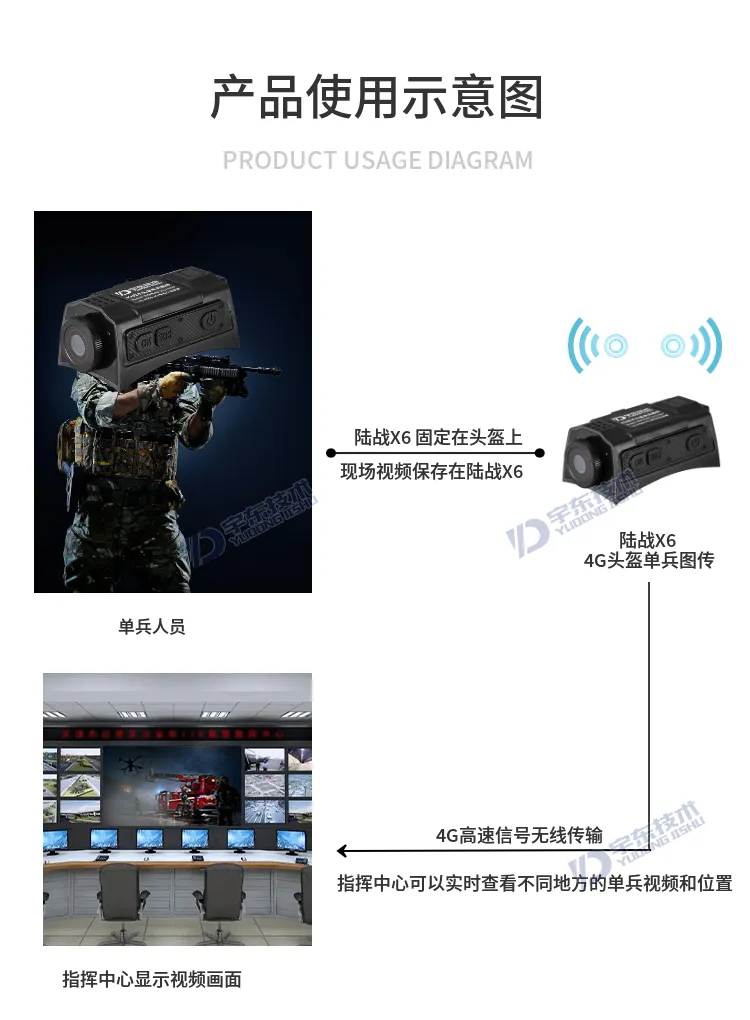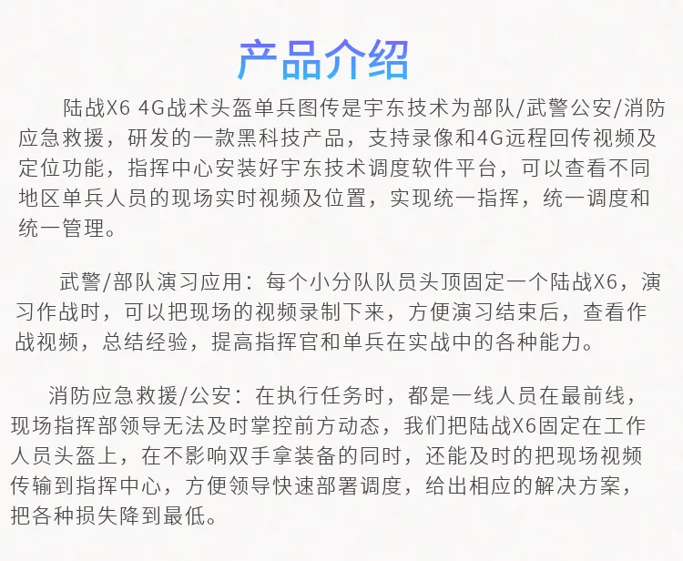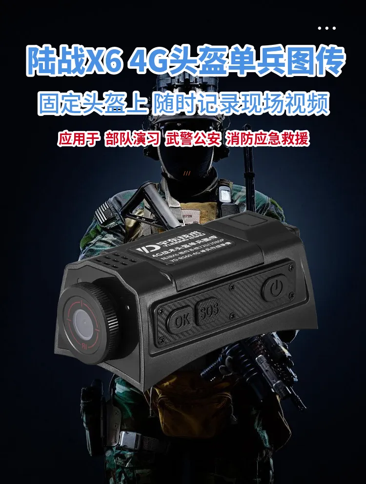 陸戰(zhàn)X6 4G戰(zhàn)術(shù)頭盔單兵無線圖傳是針對武警,特警,移動執(zhí)法取證、行政監(jiān)管等單人便攜式監(jiān)控需求應(yīng)用場景開發(fā)的專用設(shè)備,該產(chǎn)品采用高速處理器和嵌入式Linux操作系統(tǒng),集超低照度彩色攝像機(jī)、音頻、4G和Wi-Fi無線通訊模塊、北斗、存儲、報警等模塊,配置高清夜視攝像頭及無線藍(lán)牙耳機(jī)。設(shè)備可通過4G、Wi-Fi無線網(wǎng)絡(luò)進(jìn)行實(shí)時視音頻信息傳輸、語音對講等功能;協(xié)同后端功能完善的監(jiān)控調(diào)度指揮平臺系統(tǒng)實(shí)現(xiàn)針對戶外移動式個體的遠(yuǎn)程調(diào)度指揮功能。
