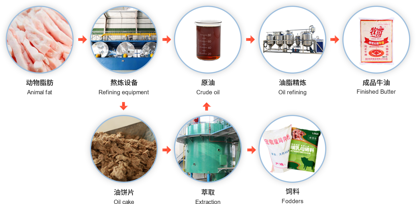 動(dòng)物油設(shè)備正規(guī)大型流水線工藝大致分為:絞肉、輸送、分料、蒸煮、油渣分離、過(guò)濾、熬煉毛油、精煉。