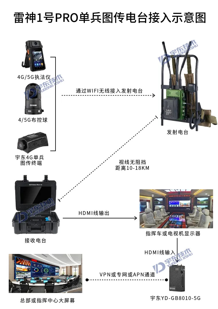 宇東技術(shù)雷神1號(hào)PRO背負(fù)式高清單兵無線圖傳電臺(tái),是公司針對(duì)應(yīng)急救援指揮、部隊(duì)拉練演習(xí)、公安、反恐作戰(zhàn)、消防救援、邊防執(zhí)勤、海警海關(guān)巡檢、森林消防等,在突發(fā)重大事件,斷網(wǎng)斷電,通信中斷的情況下,現(xiàn)場(chǎng)工作人員通過宇東雷神1號(hào)PRO單兵無線圖傳電臺(tái),可以和指揮部雙向語音通話對(duì)講,把現(xiàn)場(chǎng)采集的數(shù)據(jù)實(shí)時(shí)無線傳輸?shù)街笓]車/臨時(shí)指揮部大屏幕,讓指揮部領(lǐng)導(dǎo)對(duì)現(xiàn)場(chǎng)情況一目了然,節(jié)省了到達(dá)現(xiàn)場(chǎng)的時(shí)間,可快速做緊急指揮調(diào)度,最大限度的減少突發(fā)事件帶來的各種損失。